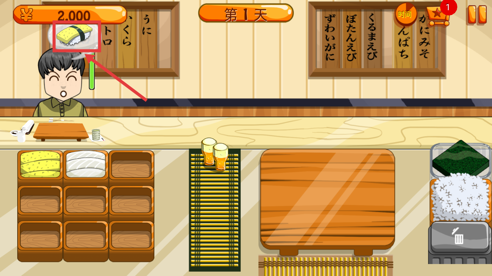 2、留意顾客头顶【寿司需求图标】,明确订单后从下方食材区挑选对应原料,为制作做准备。