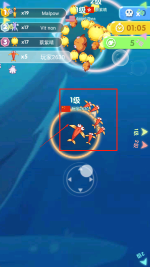 2、控制小鱼移动:操控小鱼群体在海底穿梭,寻找比自身更小的群体,锁定目标准备发起攻击,扩大势力。
