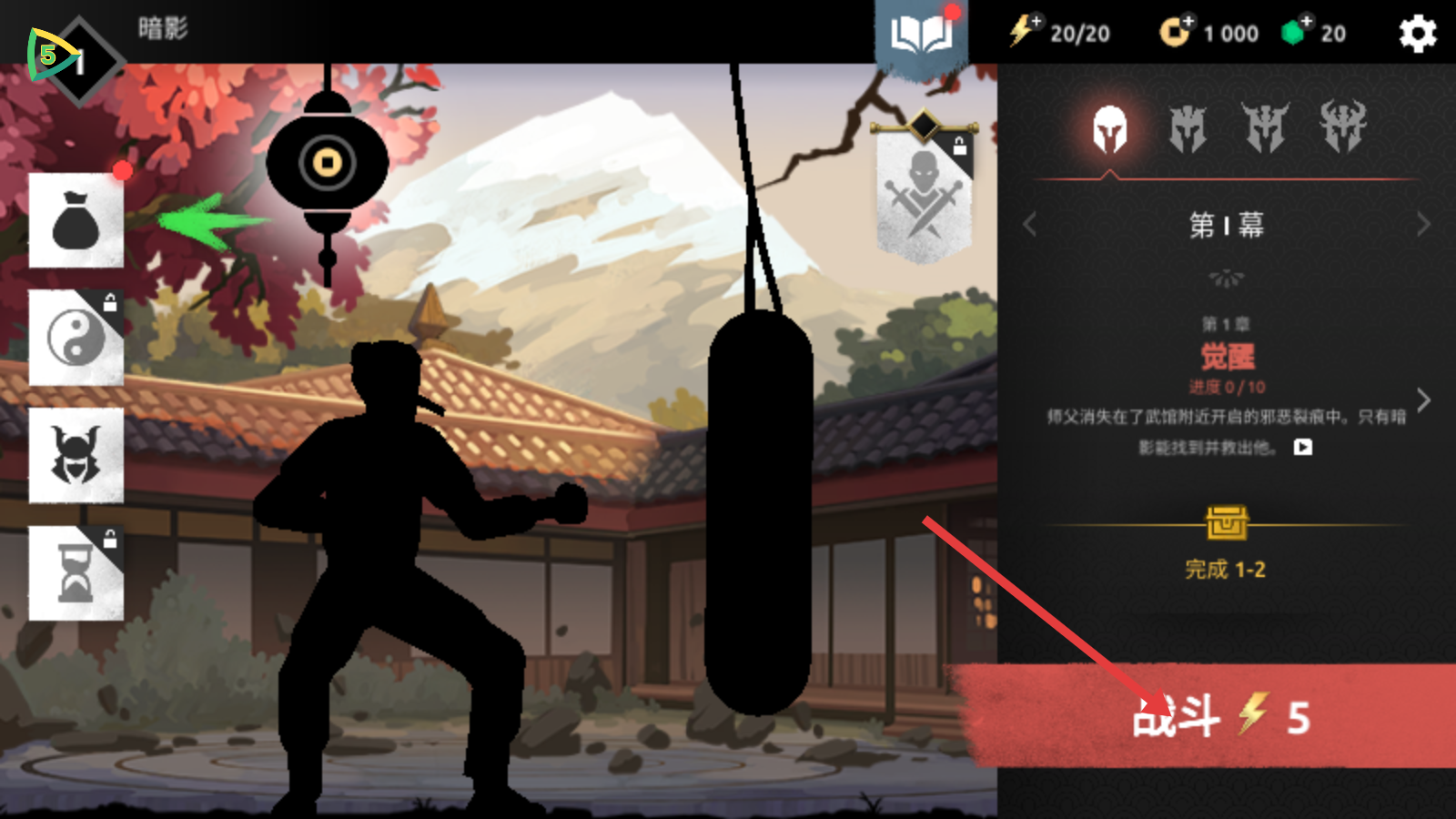 1、点击【战斗-5】开启第1幕【觉醒】任务,推进主线,解救消失的师父,解锁后续挑战。