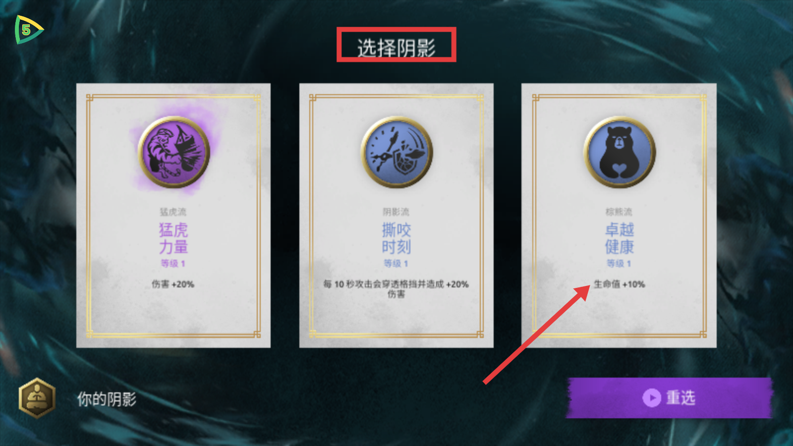4、暗影技能抉择:每场胜利后三选一强化能力,根据当前流派选择属性加成或特殊效果构建成长路线。