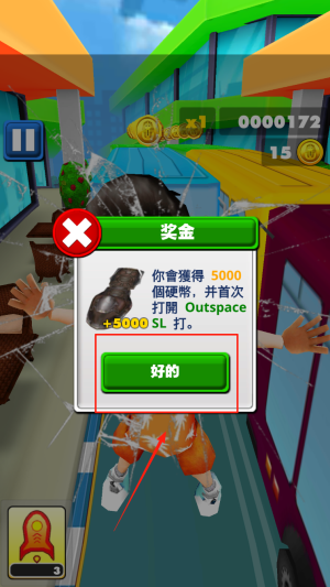 3、查看奖金:当“172 奖金”弹窗出现,点击“好的”即可领取5000金币并解锁Outspace 5000SL。