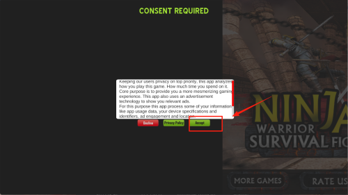 1、同意条款:在“CONSENT REQUIRED”界面,阅读后点击确认进入游戏。
