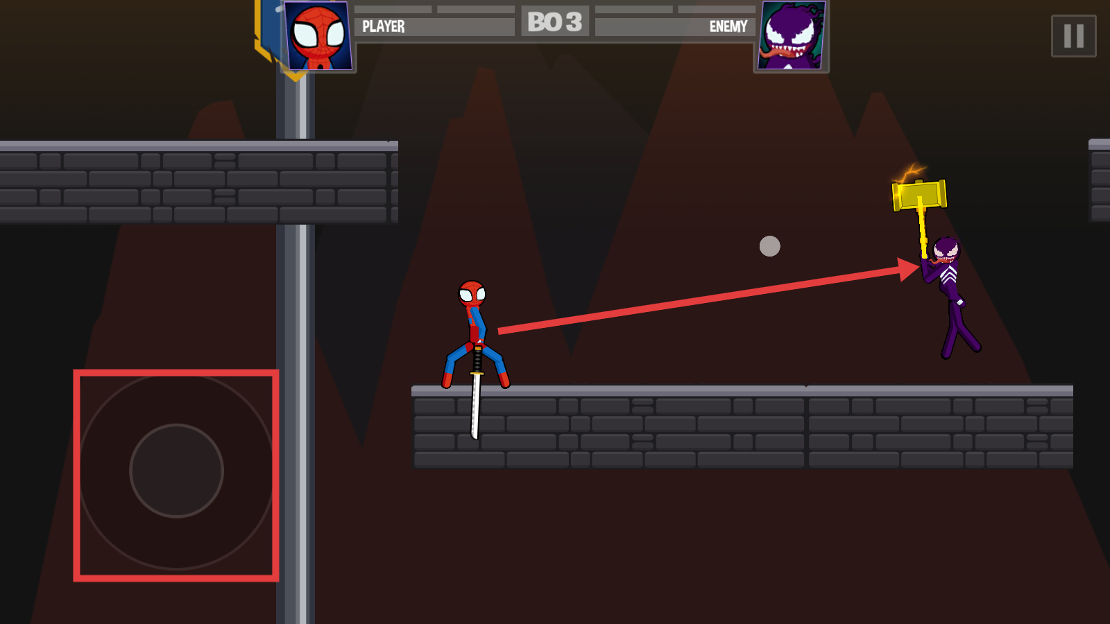 1、战斗开局通过【虚拟摇杆】操控角色,紧盯敌人【持锤】动作,预判攻击轨迹,灵活调整站位。
