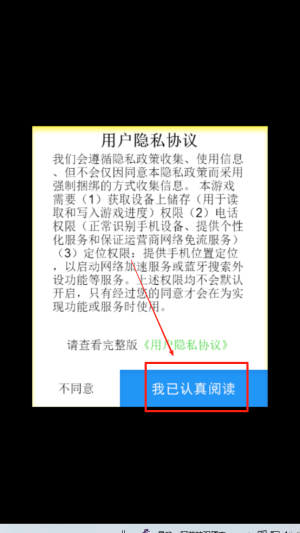 1、阅读协议:在游戏启动时,点击“我已认真阅读”按钮接受用户协议。