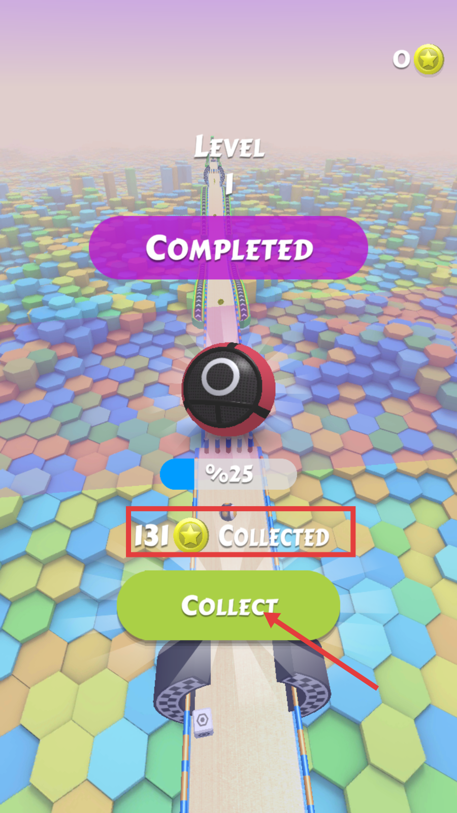 4、抵达终点后,确认【131Collected】星星数,点击【Collect】按钮领取奖励,解锁下一关。
