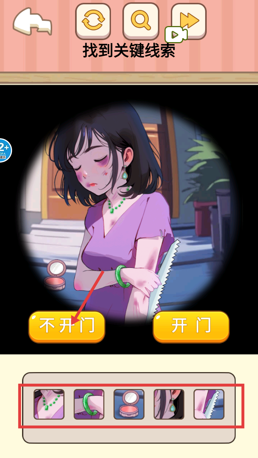 3、收集下方5个线索(珠宝/粉饼/锯子等),选择【不开门】决策。