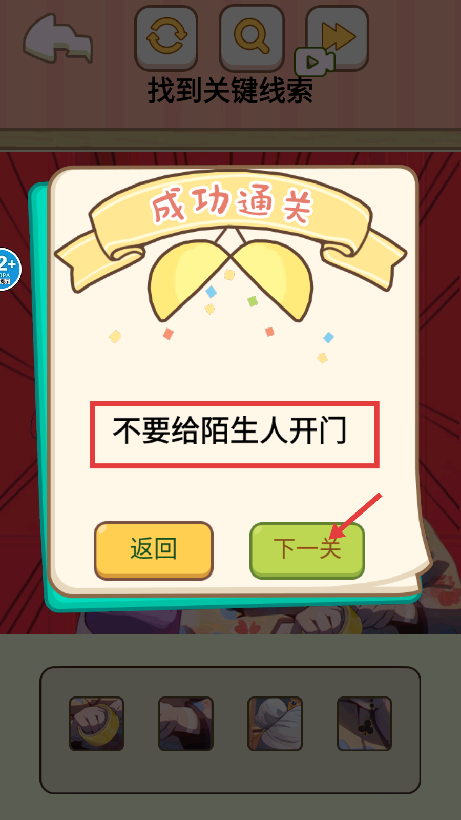 4、达成「不要给陌生人开门」结论后,点击【下一关】推进。