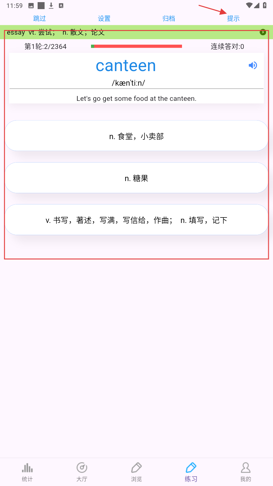 1、在【练习】页做单词题,遇不确定的,可点【提示】获取线索,辅助答题。