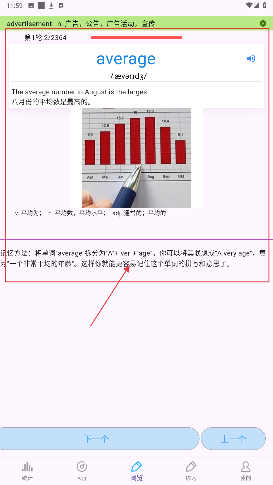 3、进入【浏览】页,借助图片、词源、相似词等,深度理解单词,强化记忆。如若切换点击【下一个】按钮。