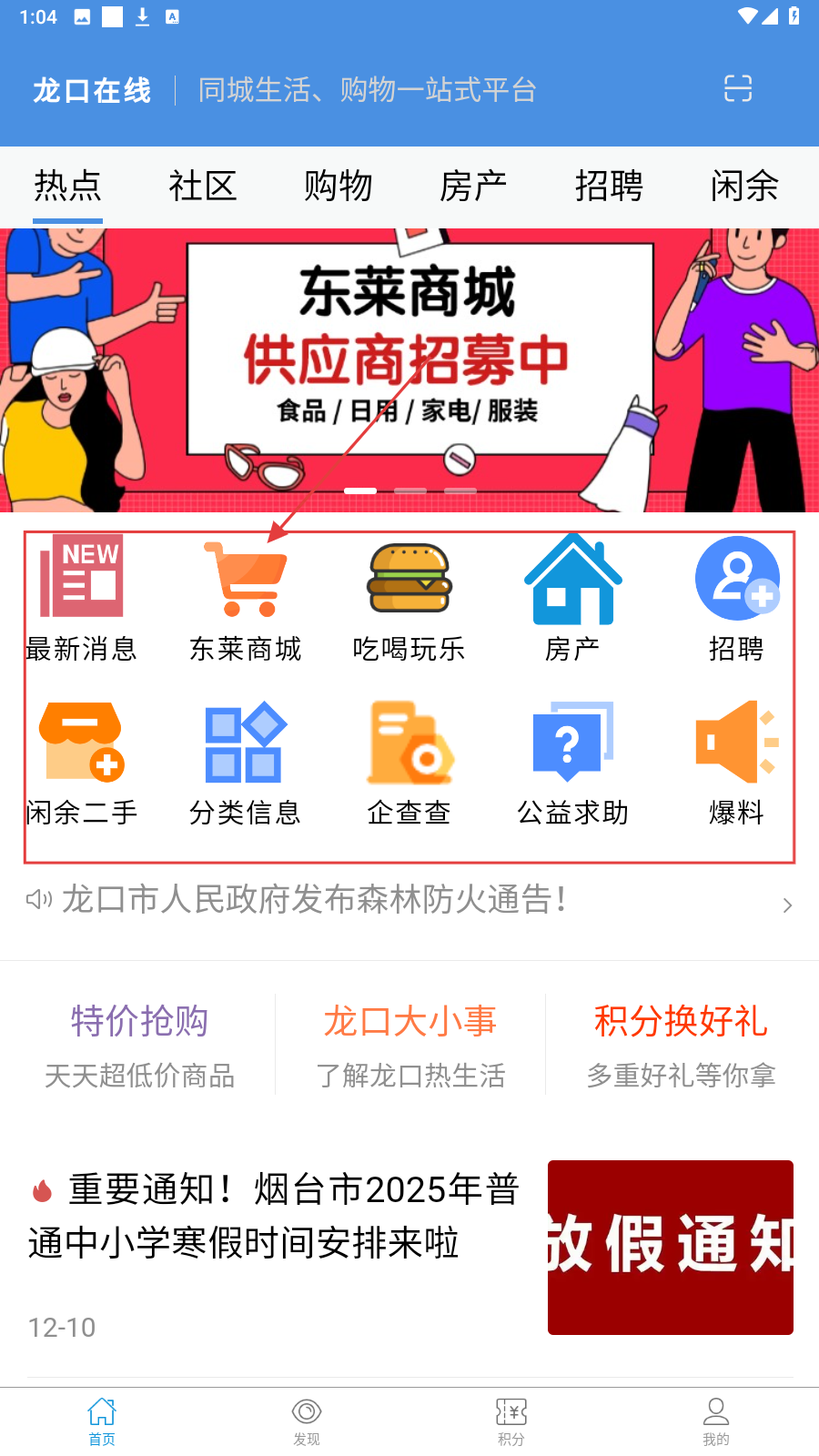 1、进入【龙口在线】首页,点对应功能入口,如【东莱商城】,开启购物。