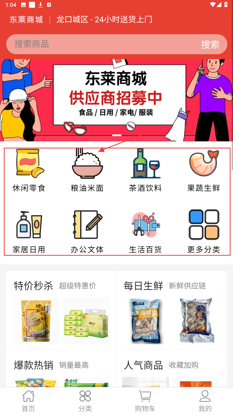 2、在【东莱商城】选分类,如【粮油米面】,精准找想买的商品品类。
