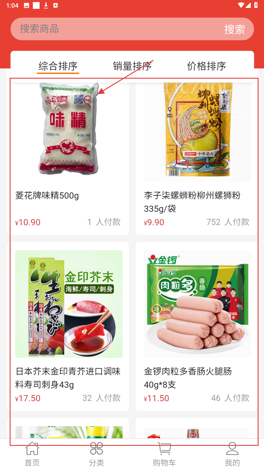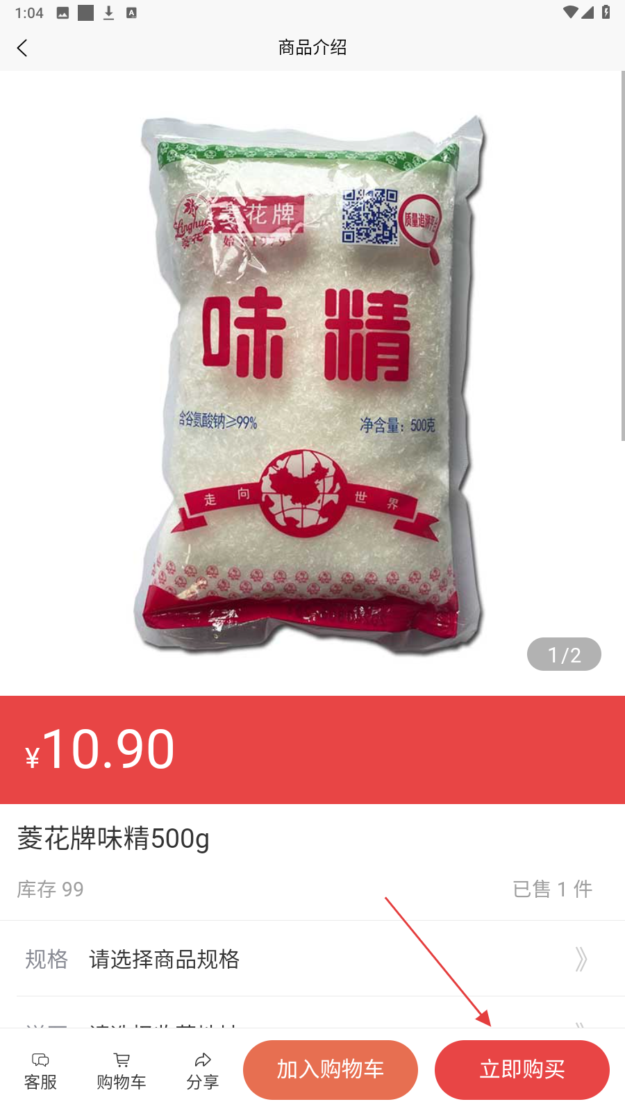 3、浏览商品列表,选心仪商品,如【菱花牌味精500g】,查看详情。