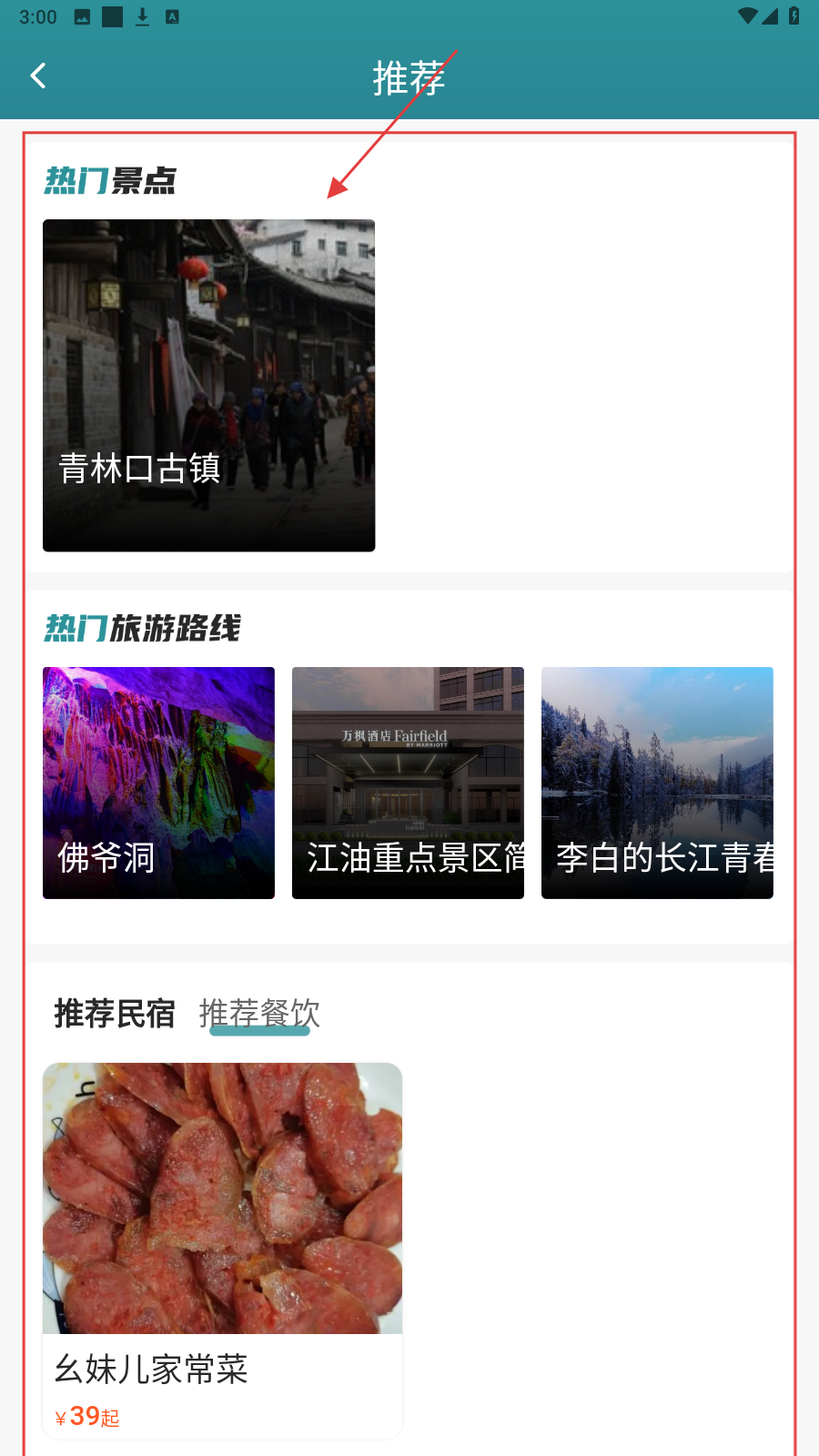 2、在推荐页,选【热门景点-青林口古镇】,查看景点及周边游玩推荐。