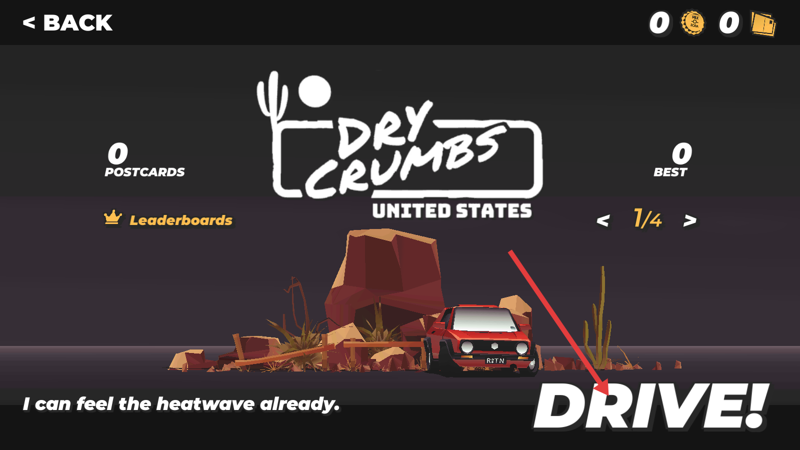 1、主界面点击【DRIVE!】,进入美国荒漠主题驾驶关卡,开启竞速挑战。