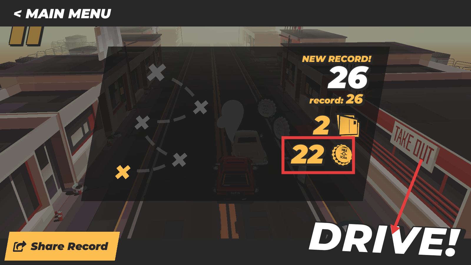 4、结算界面查看【22金币】收益,点击【DRIVE!】重开,刷新纪录、积累资源。