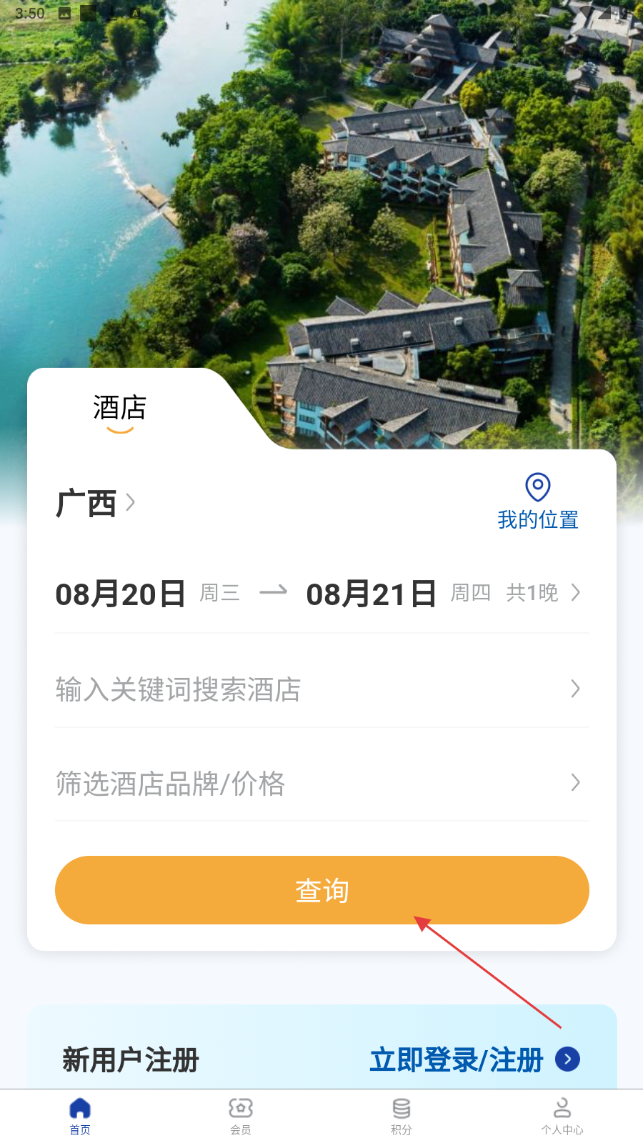 1、在首页选【广西】,填入住/离店日期,点【查询】找酒店。