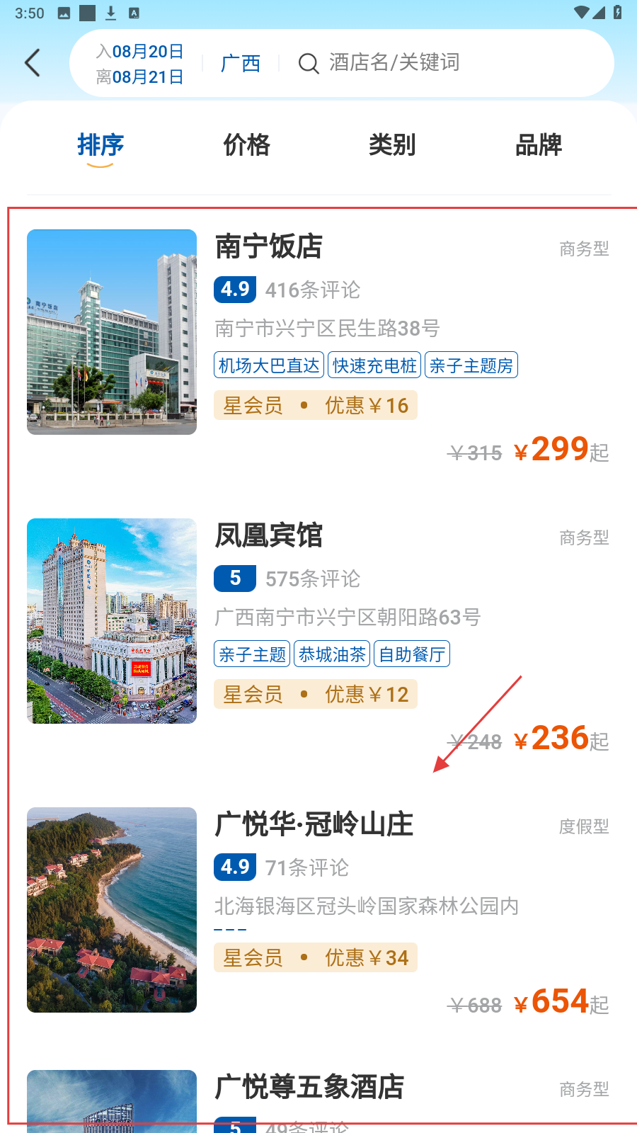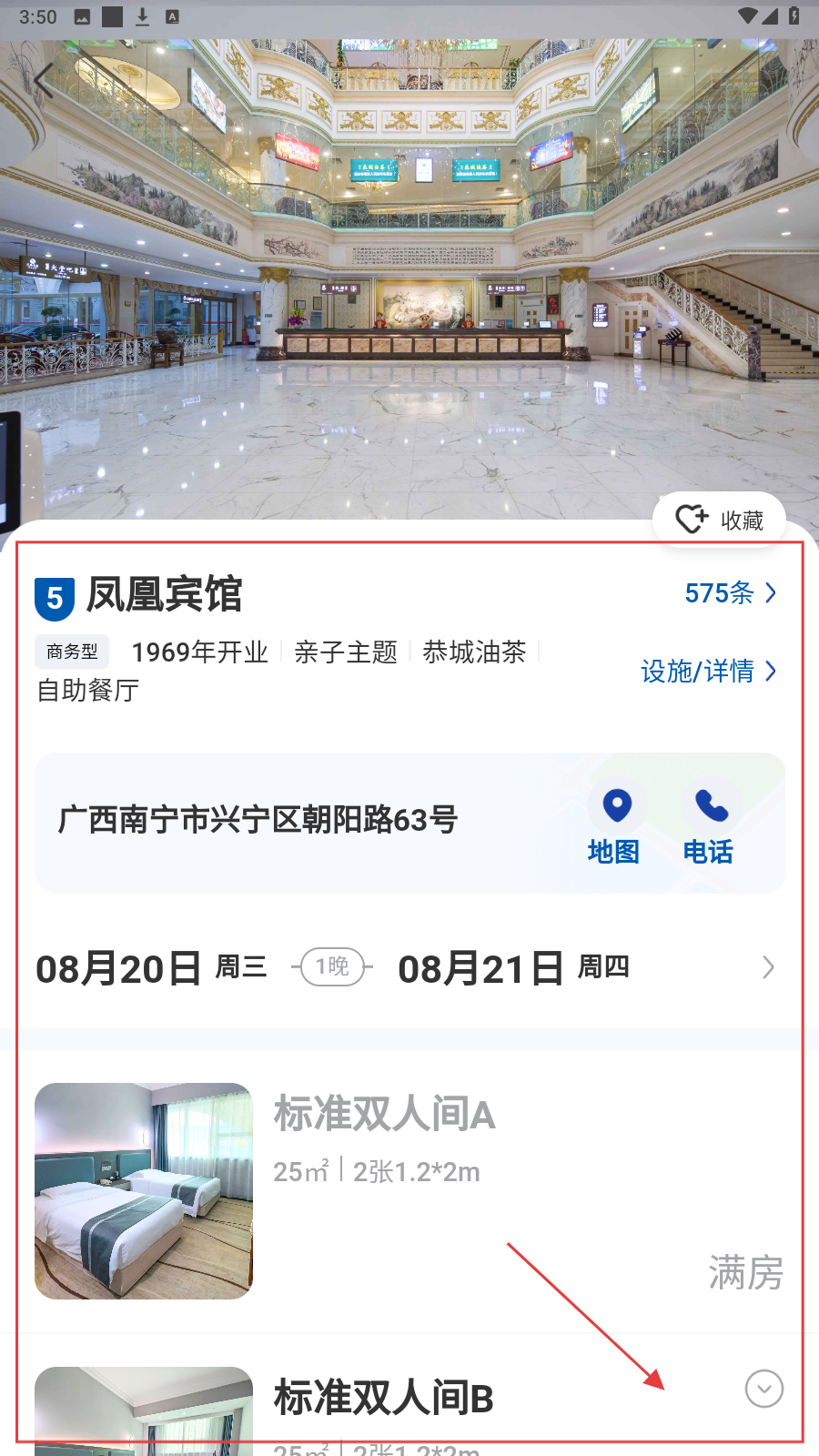 2、在酒店列表,选心仪酒店(如【凤凰宾馆】),查看基础信息与价格。