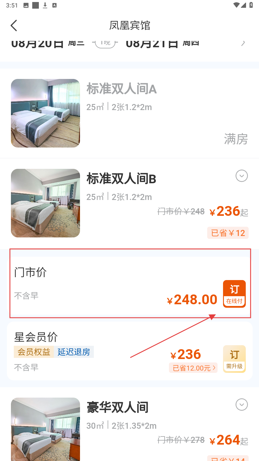 3、进入酒店详情页,浏览房型(如标准双人间A/B)、日期等,确认可订房型。