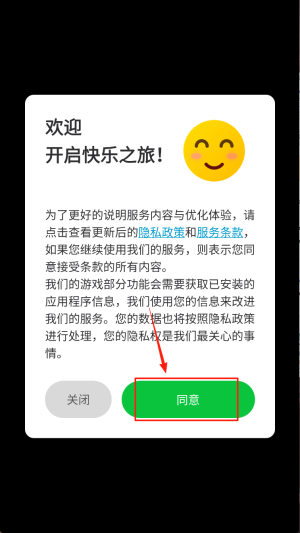 3、在“欢迎 开启快乐之旅!”弹窗中,点击“同意”接受隐私政策与服务条款。