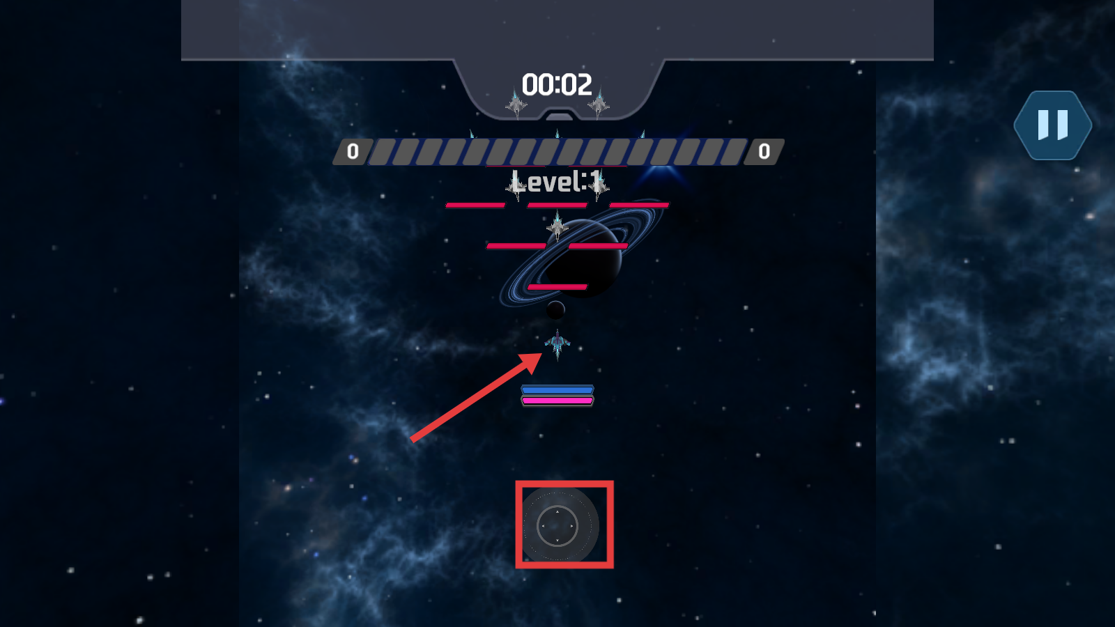 2、关卡内通过底部【操控圆盘】控制飞船移动,在Level-1阶段灵活调整位置应对敌人。
