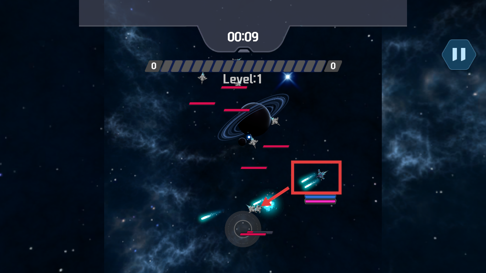 3、战斗时操控飞船瞄准敌方单位,发射弹幕攻击,凭借射击击溃Level-1的太空敌手。