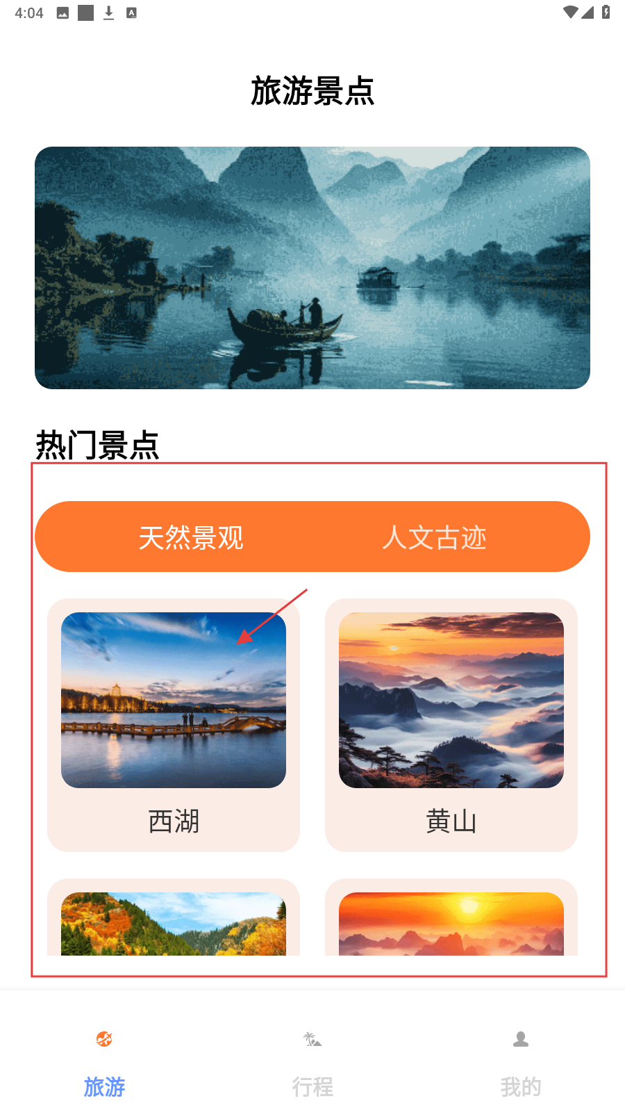 1、在【旅游】页,选【天然景观】或【人文古迹】(如西湖),查看景点。