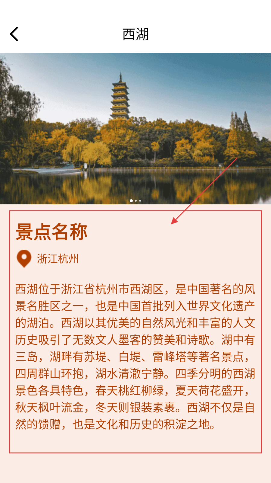 2、进入景点详情页,了解西湖位置(浙江杭州)、介绍等信息。