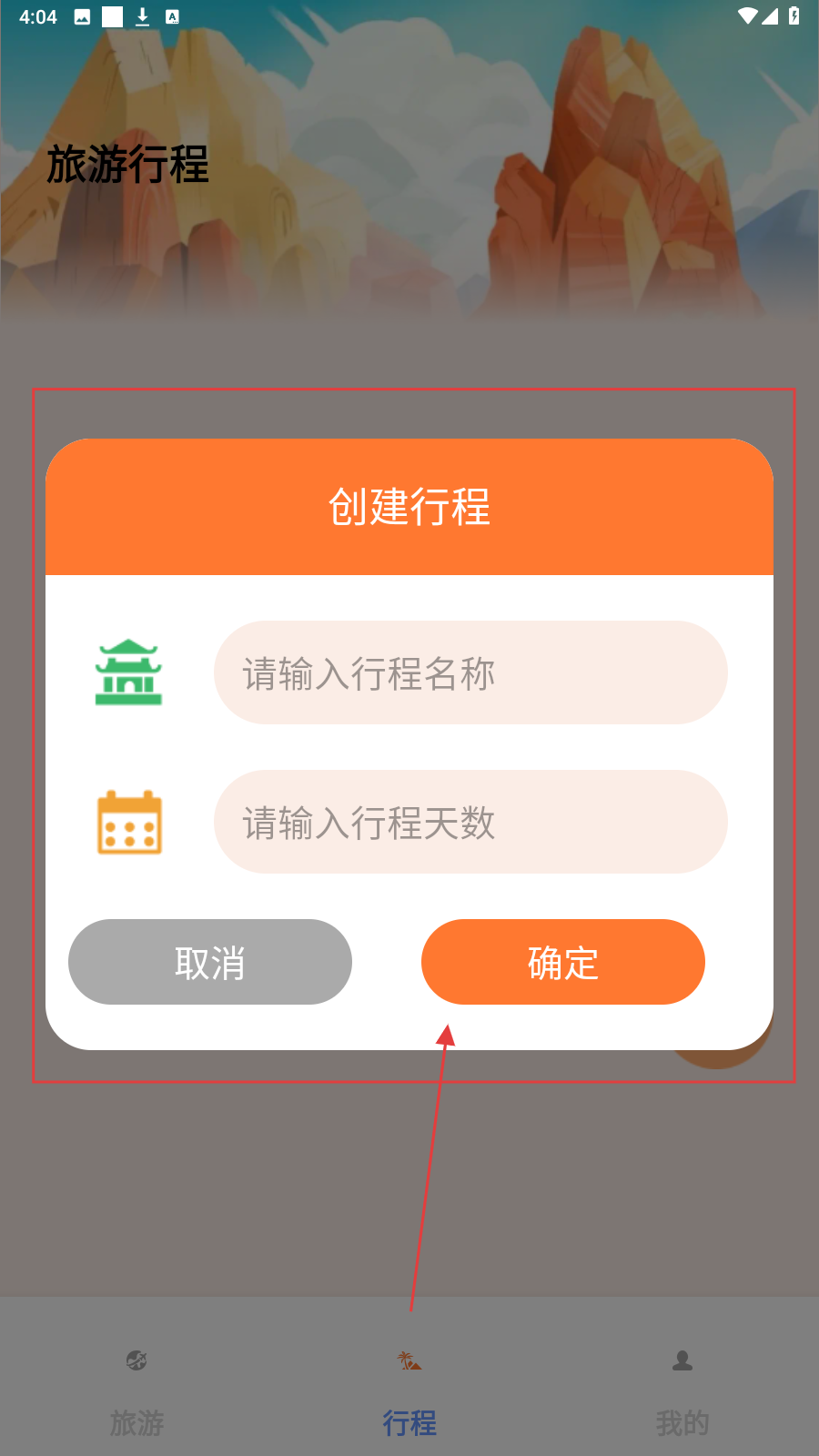 4、填写行程名称、天数填好信息后点【确定】,完成旅游行程创建。