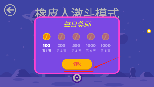 1、在“橡皮人激斗模式 每日奖励”界面,点击“领取”领取第1天100金币奖励。