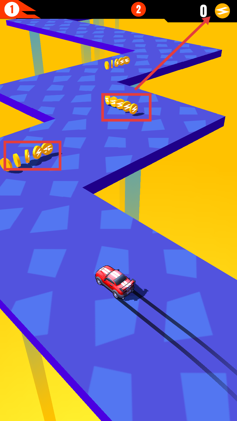 2、赛道行驶中,优先收集【金币】与【闪电】道具,积累资源助力后续关卡推进。