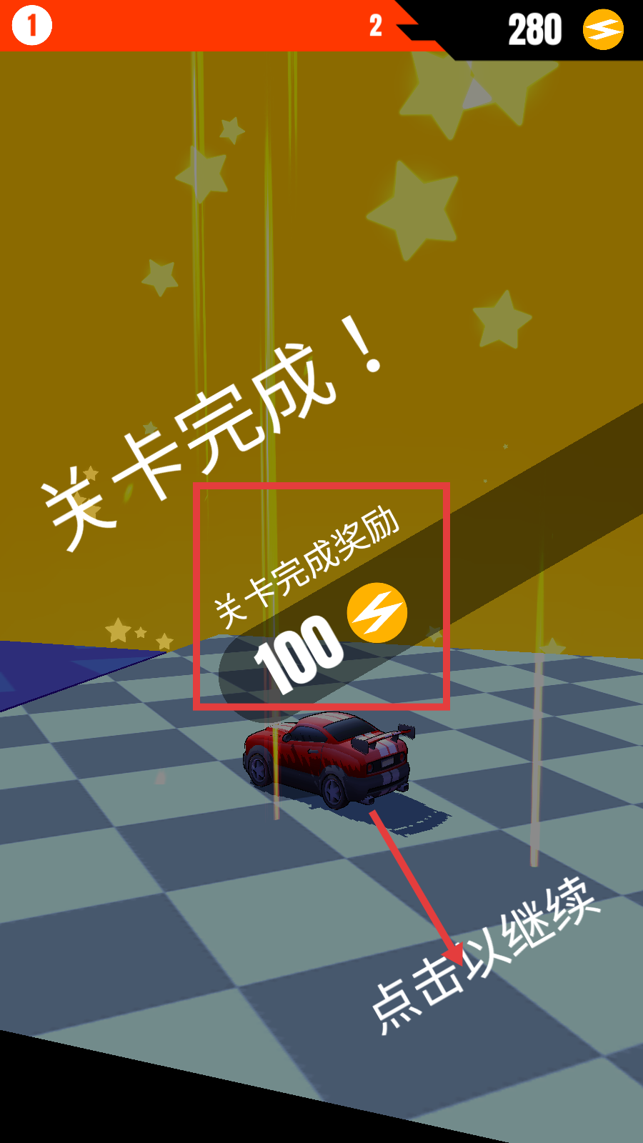 4、关卡完成后,获取【关卡完成奖励-100闪电】,点击【点击以继续】解锁新挑战。