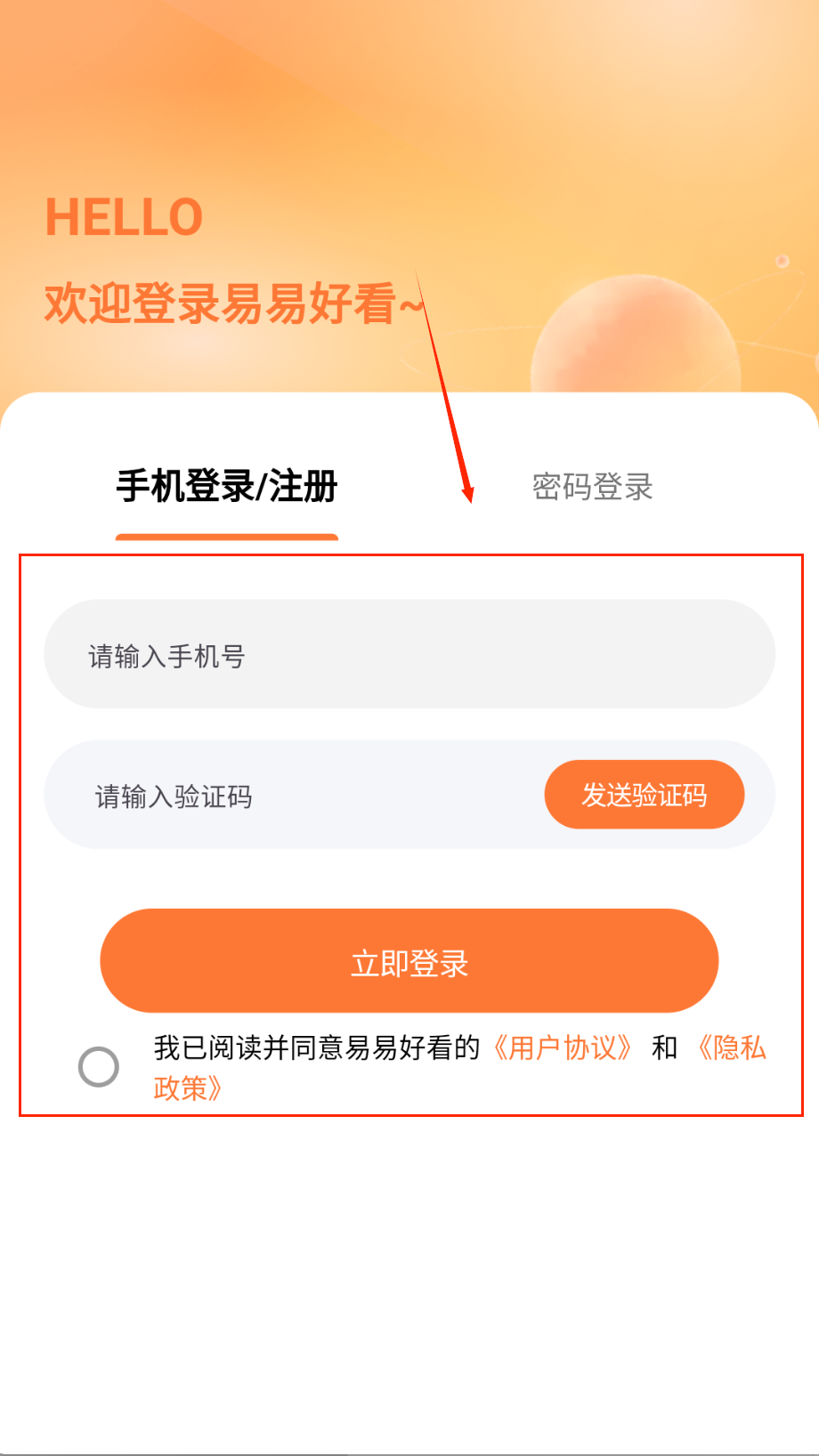 3、登录界面是暖暖的橙黄色,选手机号登录的话要输验证码,点发送验证码等短信来,别忘了勾选下面的协议选项才能登录呀。
