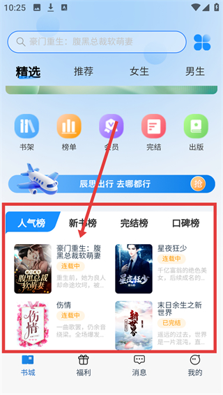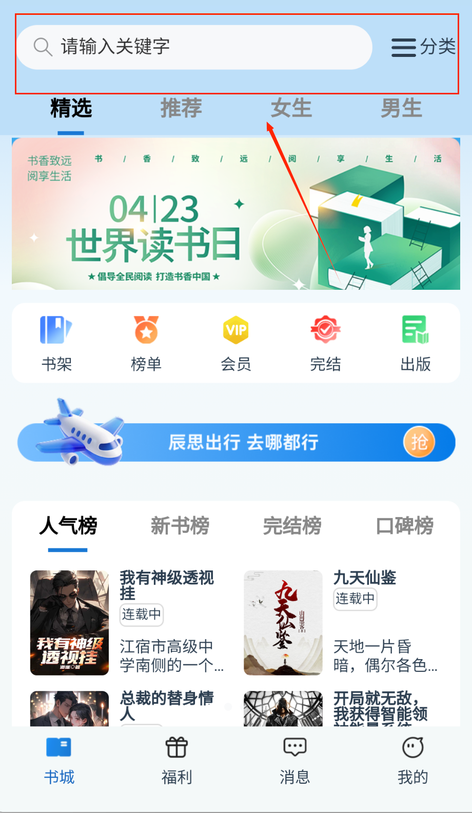 1、完成注册后可在书城浏览编辑推荐与热门榜单,通过分类筛选或搜索框查找目标作品,搜索结果会显示作品简介与最新章节信息。