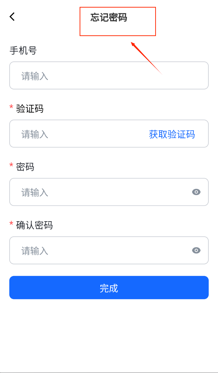 3、忘记密码也不怕呢,在页面输手机号获取验证码,设置新密码要输两遍确认,最后点完成按钮就行啦。