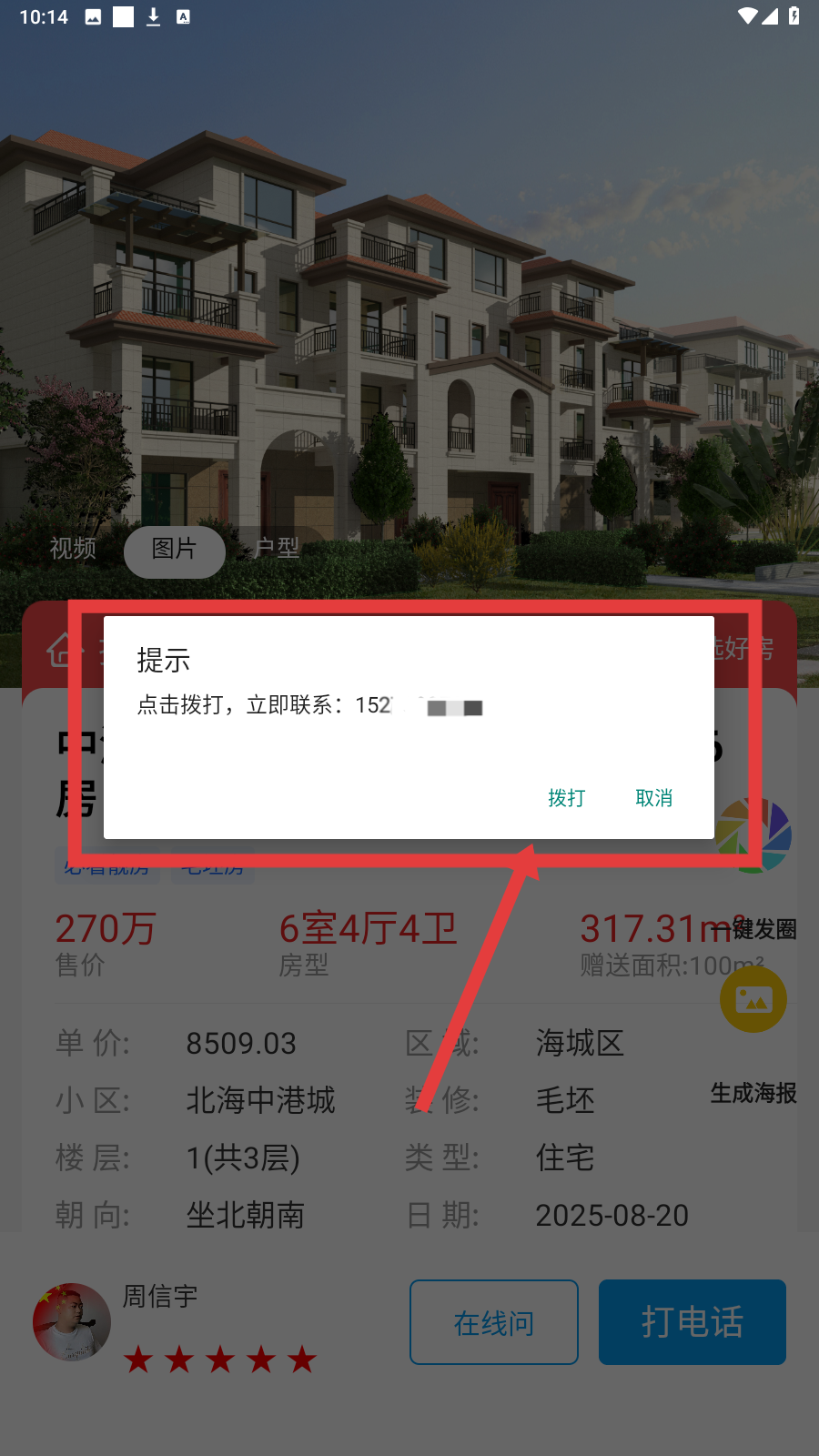 4、确认拨打提示,点【拨打】与经纪人沟通,推进购房流程。