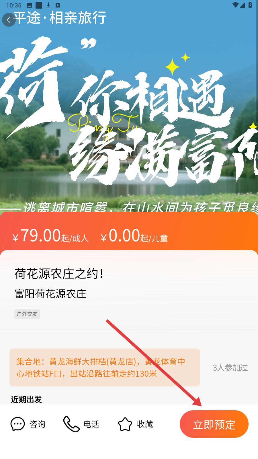 4、在行程详情页,确认集合地等信息后,点【立即预定】,完成跟团游预订。