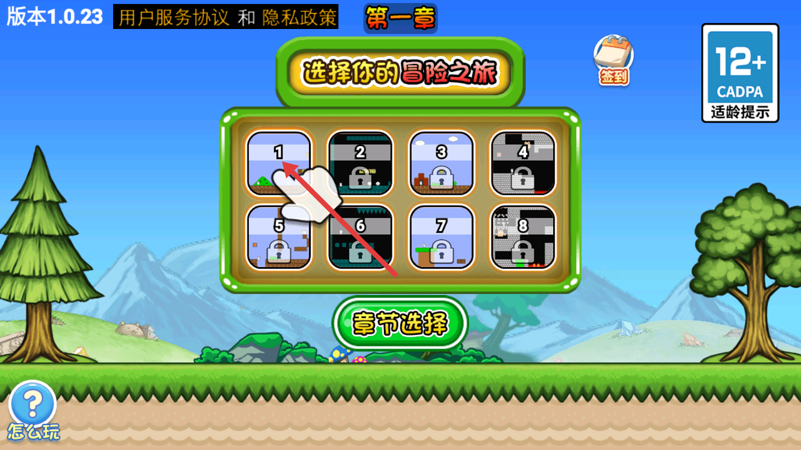 1、点击【章节选择-第1关】开启冒险,作为新手首关,熟悉基础玩法与场景机制。