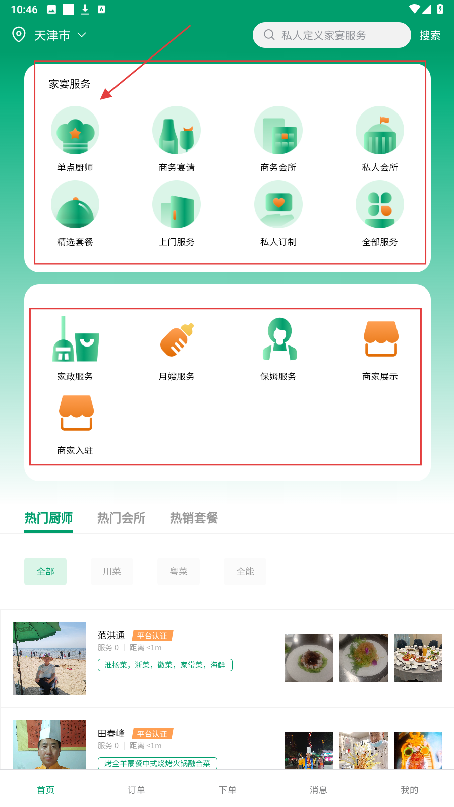 1、打开平台,按需选【家宴服务-单点厨师】或【家政服务-保姆服务】等。