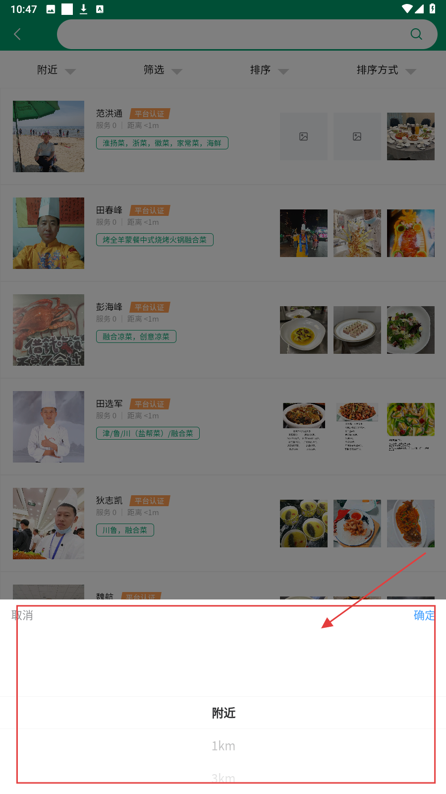 3、如点击【附近】功能,选【1km】等距离,限定厨师范围。