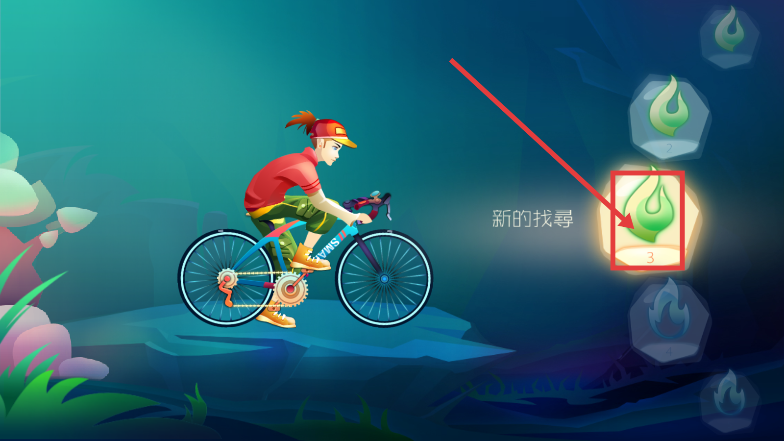 1、选择右侧标有「3」的关卡(新的找寻),进入第3关冒险,开启骑行挑战。