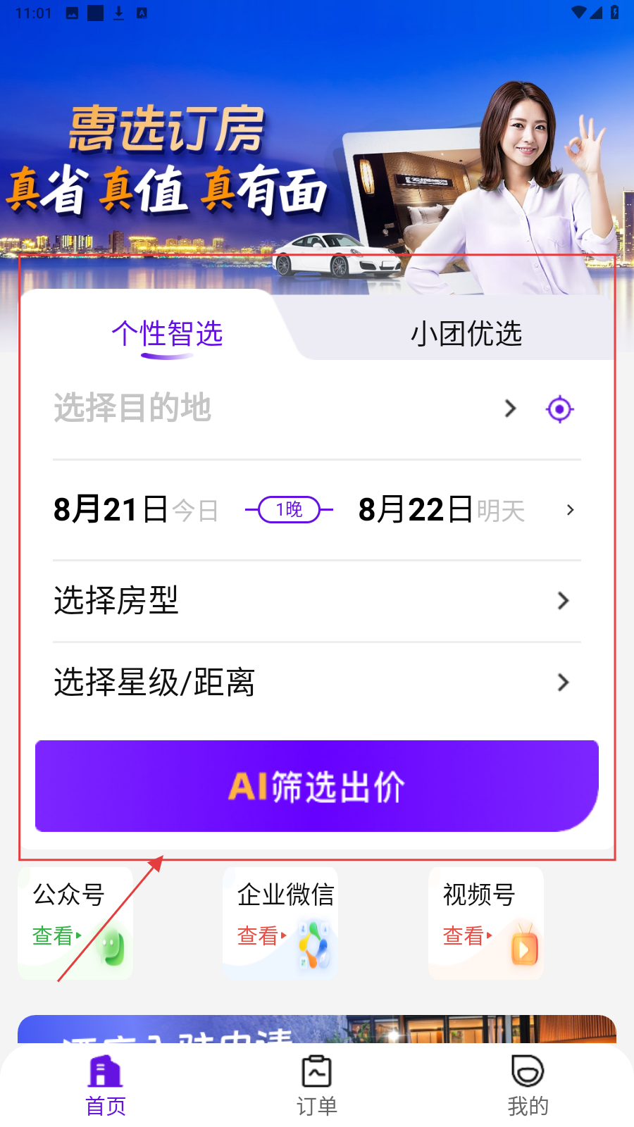1、进入订房页,选目的地、日期、房型等,点【AI筛选出价】找合适酒店。