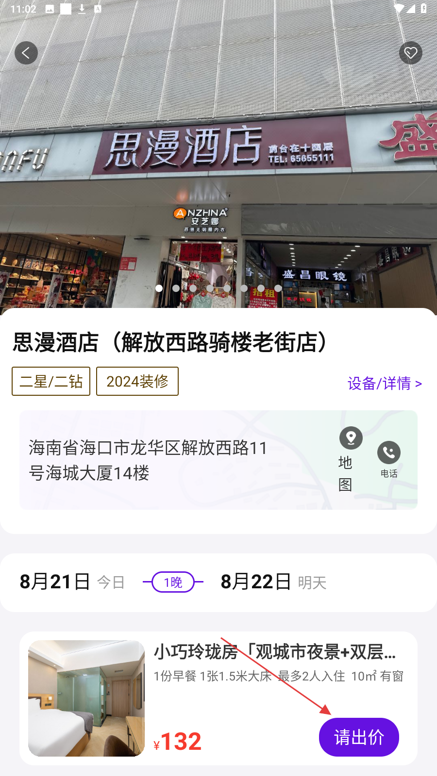 3、进入酒店详情页,选房型(如小巧玲珑房),点【请出价】了解价格。
