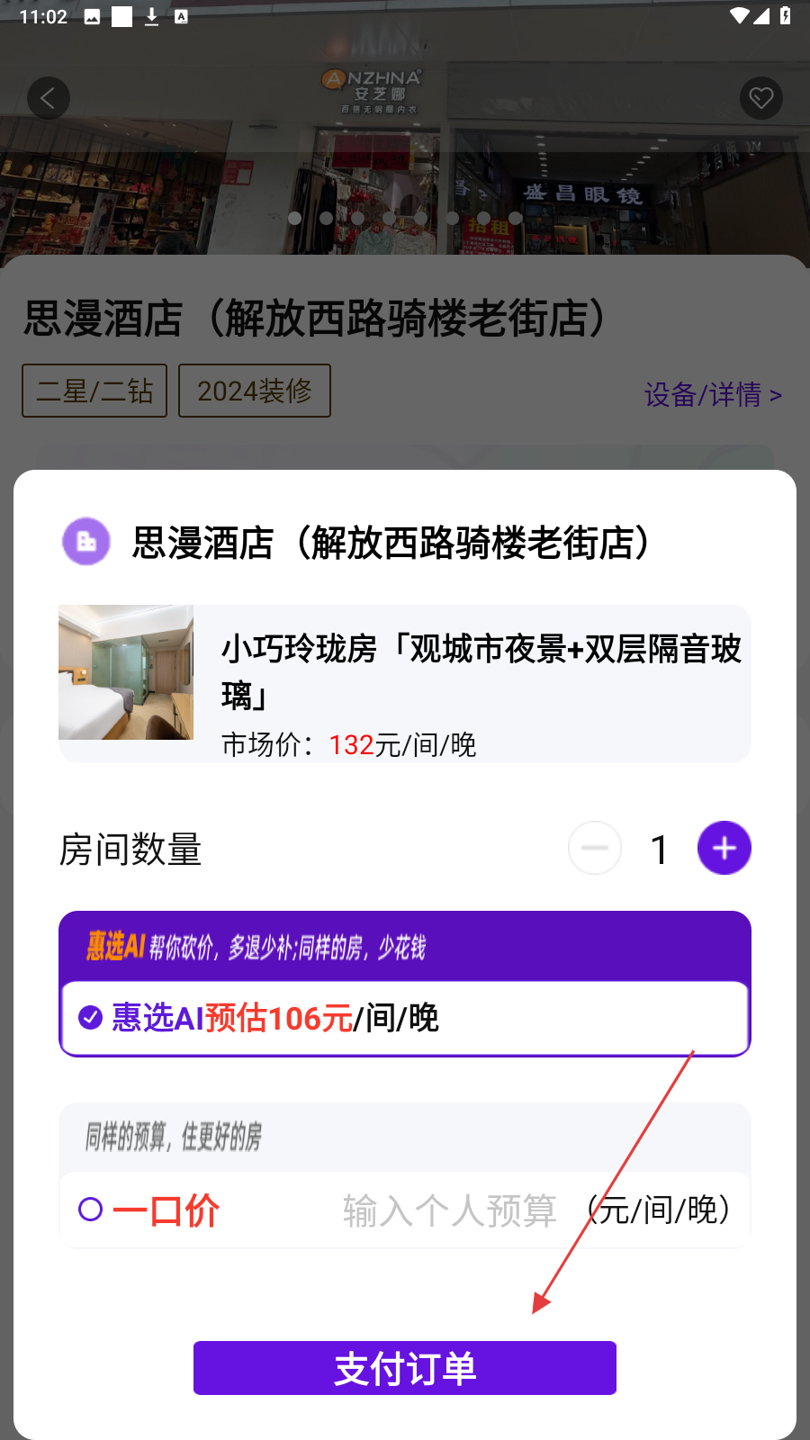 4、确认房间数量、价格,选【支付订单】完成酒店预订。