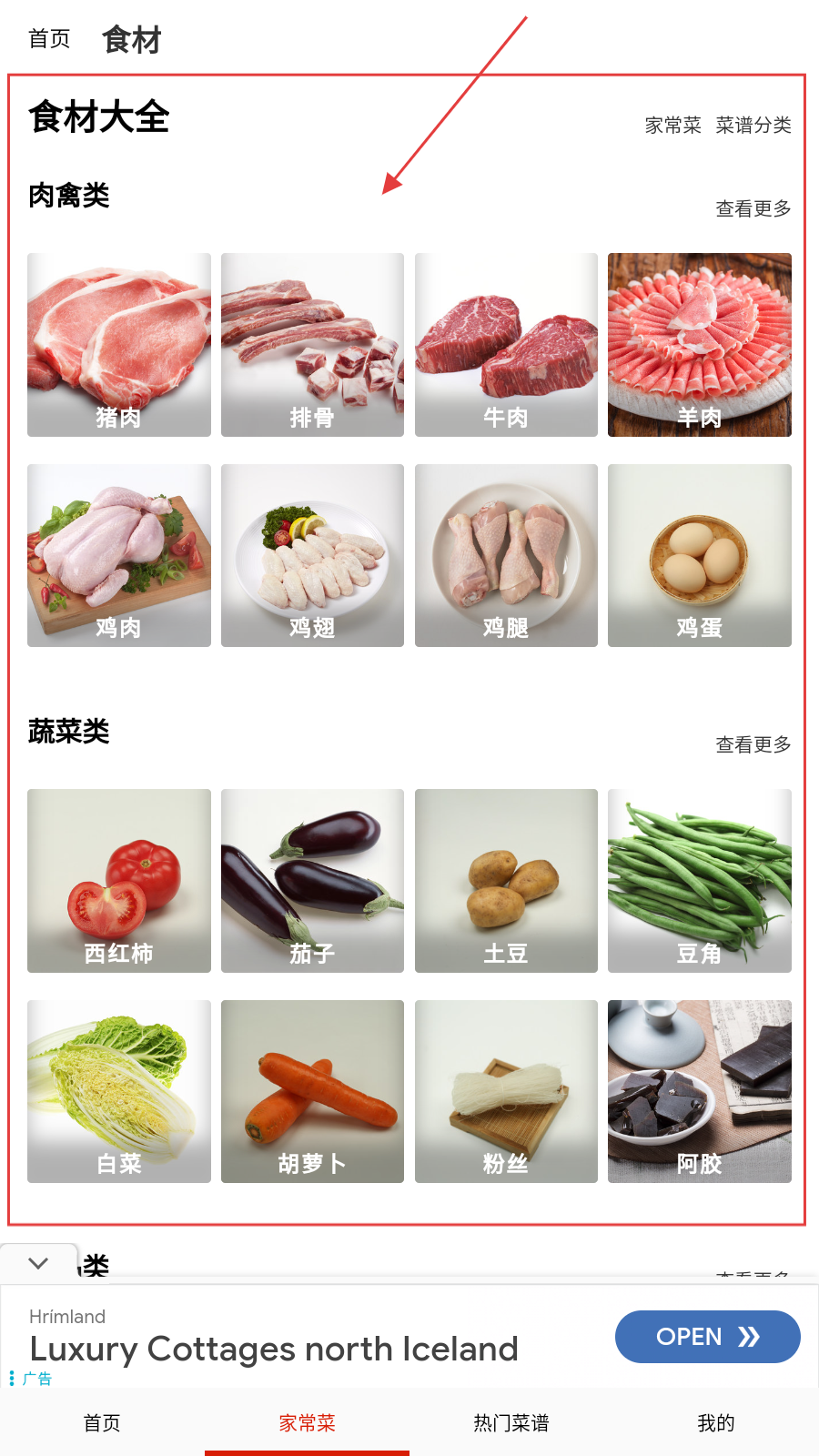 1、进入食材页,从【肉禽类】【蔬菜类】选需用食材(如猪肉、西红柿)。