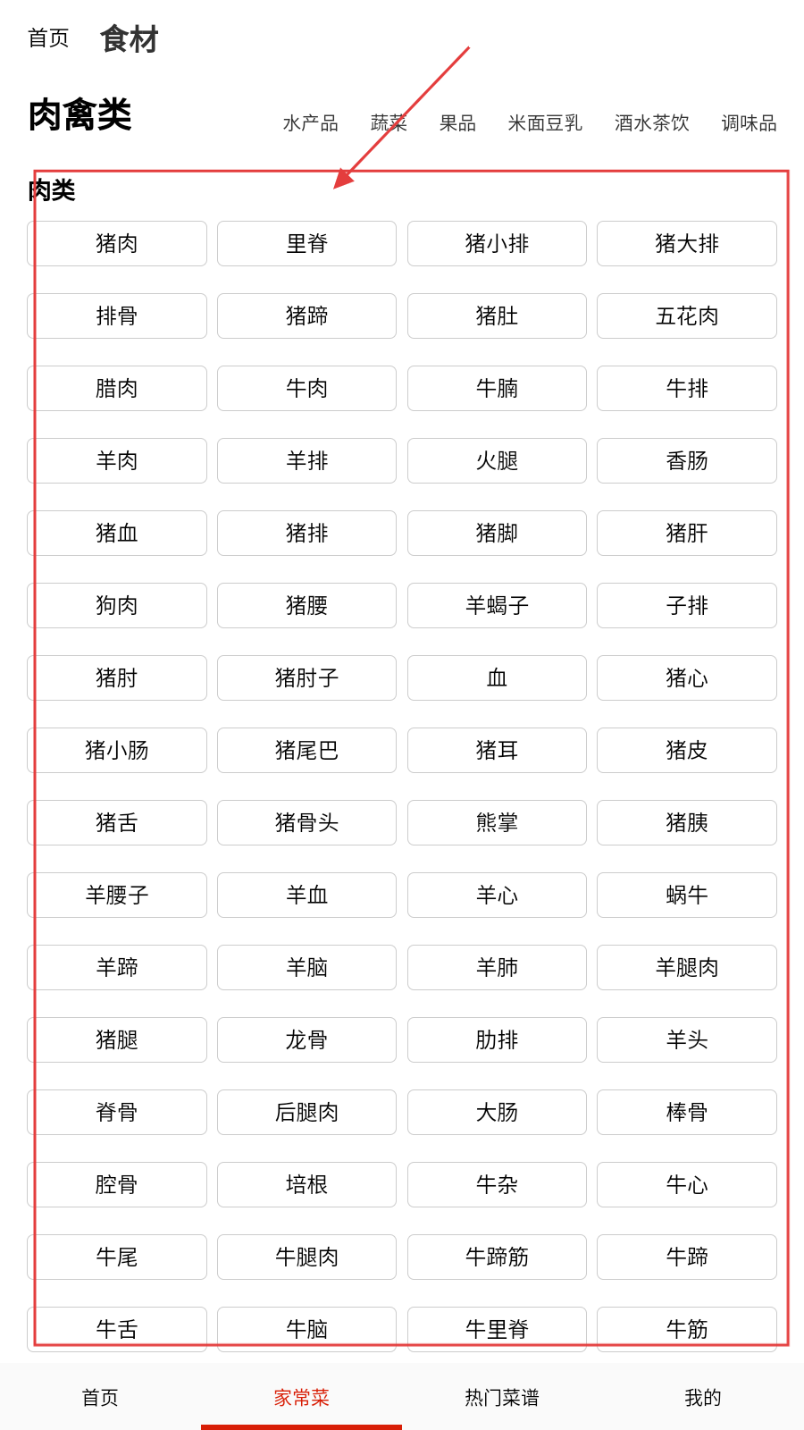 2、点肉禽类,在细分列表(猪肉、里脊等)精准选特定食材部位。