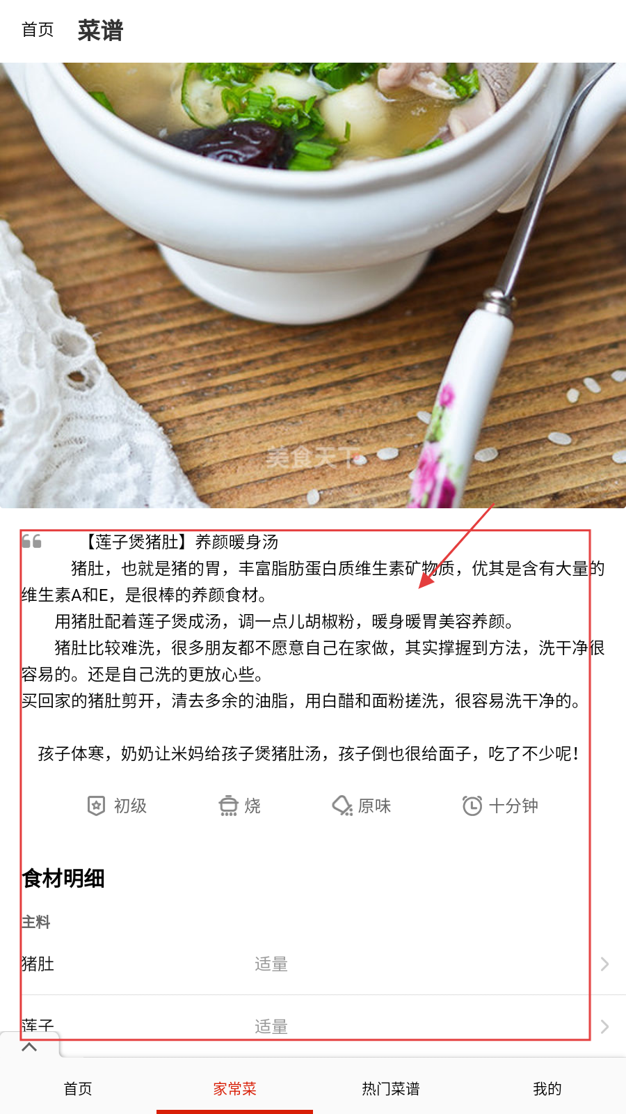 4、点进具体菜谱(如莲子煲猪肚),看营养、做法、食材明细学烹饪。