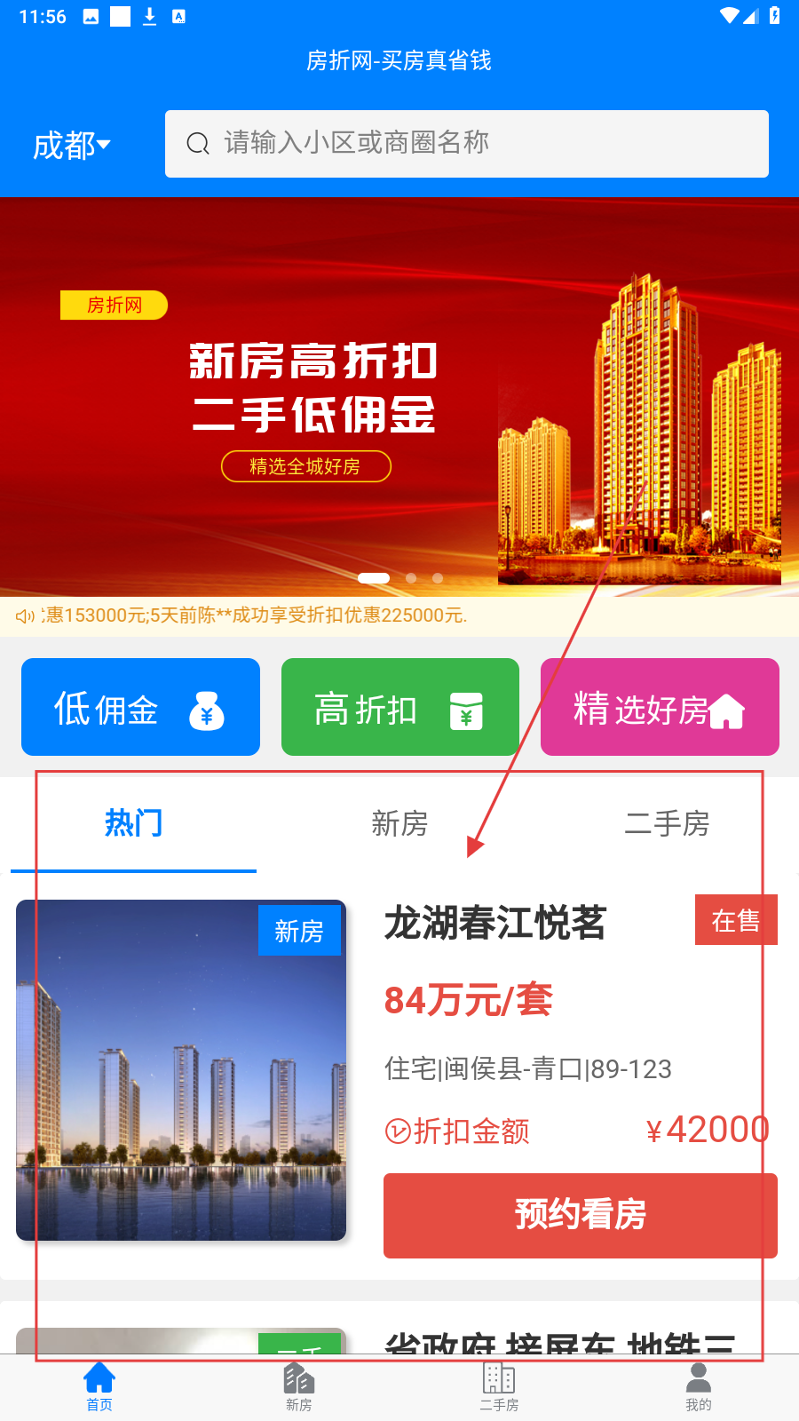 1、打开房折网,选城市后在热门/新房/二手房找心仪楼盘(如龙湖春江悦茗)。