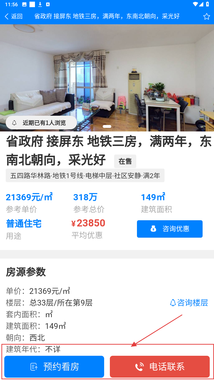 2、点进房源详情,查价格、面积等,点【预约看房】或【电话联系】对接。