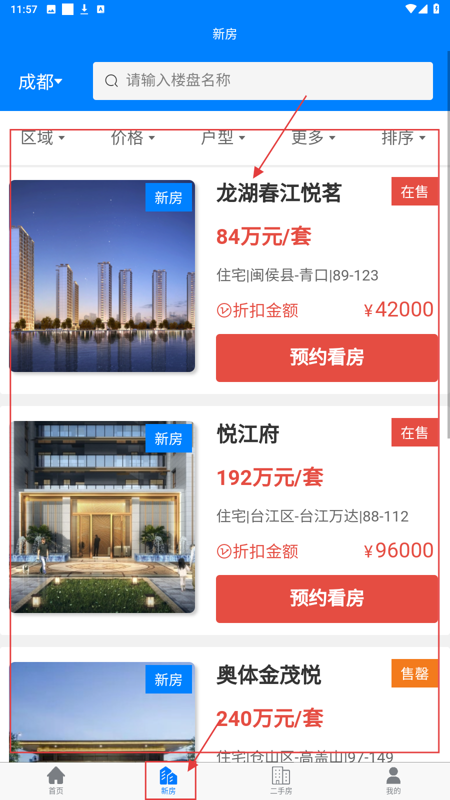 3、切【新房】页,用区域、价格等筛选项,精准找符合需求的新房。