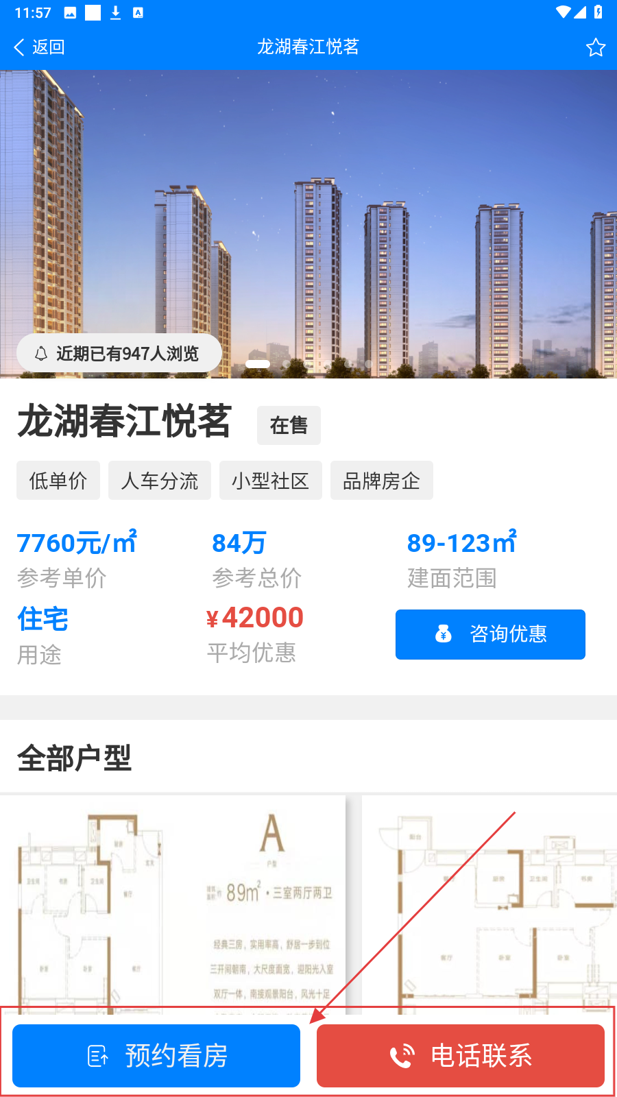 4、进入目标楼盘详情,看户型、优惠,通过【预约看房】【电话联系】进一步了解。